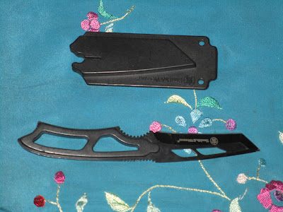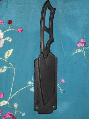 3) F., a new facebook Friend and my new Skull Son, visited. I bought from him a book with a secret compartment and a leather-bound journal (he made both). We had chocolate shakes at M.'s cafe. Gave him a heavy, brass, skull chain and a Pakistan dagger. He gave me, in turn, this travel weapon. No, I'm not traveling with it.